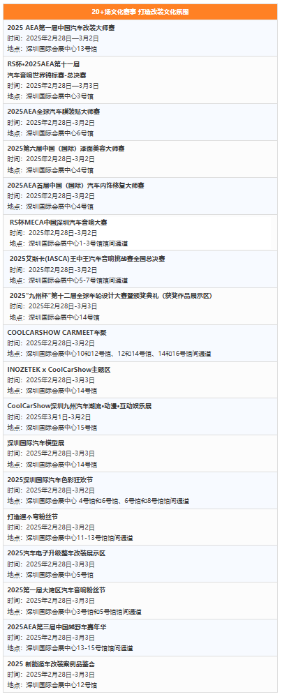 2025 第三届深圳国际性能及定制改装汽车展览会 平面规划本次展会将邀请超120家新能源与传统整车品牌,路特斯、奔驰、宝马、奥迪、迈莎锐、道朗格、捷豹路虎、巴菲特、罗伦士、虏曼、212、炎石汽车、钧天汽车、林肯、smart、雷克萨斯、沃尔沃、凯迪拉克、广汽传祺、广汽本田、广汽丰田、一汽丰田、日产、长安福特、别克、一汽大众、上汽大众、北京现代、起亚、名爵、长安马自达、问界、蔚来、理想、极氪、比亚迪、腾势、阿维塔、小鹏、广汽埃安、仰望、方程豹、零跑、智己、ICAR、极狐、深蓝、上汽大通、岚图、睿蓝、捷途、红旗、北京汽车、吉利、领克、奇瑞、荣威、长城、长安汽车、一汽捷达、东风汽车、星途、江铃汽车、江铃福特、五菱汽车、东风风行、猛士、江淮汽车等,通过展示新能源改装车、超跑、赛事赛车、豪华定制车、品牌性能车、国内外顶级改装车品牌、主流在售车的改装版/共创版车型及官方性能套件等超千款年度重磅车型现场首发,满足新消费群体个性化和差异化的汽车消费需求。