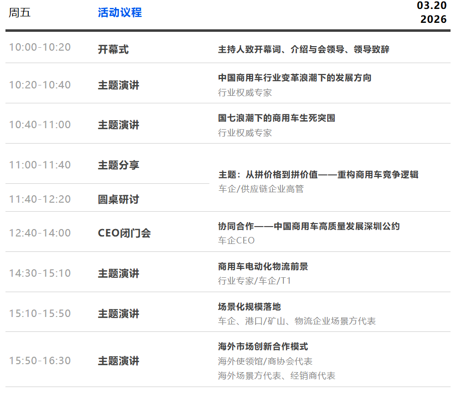 因此,为助力中国商用车提质向新,2026深圳国际商用车生态博览会暨国际卡车文化节将同期举办第三届中国商用车深圳论坛,围绕商用车行业热点重点话题,邀请相关部门协会领导、专家学者、领先企业代表、海外专业买家等,探索行业破局方向,引领产业新未来。
